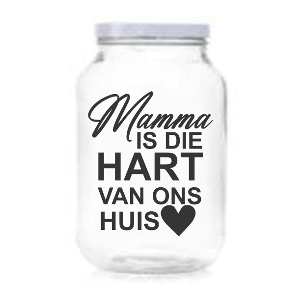 The Jars are 3 Liter Jars and designs include Cookies, Koekies, Rusks, Beskuit and Sweets. All the Jars come complete with a White Lid and Vinyl Sticker. You have a choice between White Vinyl or Black Vinyl.